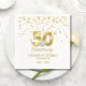 Custom, personalised 50th golden wedding anniversary disposable paper napkins. Gold colour with faux gold confetti with large 50 numbers and faux diamond heart in middle. See matching items.