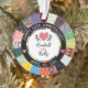 This personalised ornament features a pretty border patterned to look like a stitched patchwork quilt and reads Happy Anniversary around the rim. Customise it for a special bride and groom by including their names, and you can change the wedding date and anniversary number around the centre. Pink hearts and a variety of colourful floral, dot and stripe patterns add a cosy country feel.