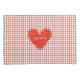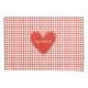 Two red felt love hearts "appliqued" with white blanket-stitch edges onto red and white gingham background. And white daisies on repeat on the reverse.