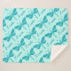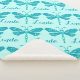 Bold stylised dragonfly named repeat patterned blanket in dark teal, aqua and white. Ideal for making a really personal sewing project for girls who love dragonflies or inked art. Customise with your own choice of name currently reads Linda. The background colour can also be changed if required currently aqua. Original inked art and design by Sarah Trett www.sarahtrett.com for www.mylittleeden.com