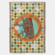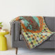 Beautiful Christmas holiday throw blanket features a cute red nosed reindeer on a background of brown, cream, aqua, orange, and mustard argyle, a strip of solid orange, and an aqua blue centre with white polka dots and snowflakes. Easily customise this holiday throw blanket with your name!