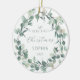 Celebrate baby's first Christmas with this keepsake ornament, featuring a watercolor wreath of green eucalyptus leaves. The word "Christmas" appears in delicate green handwriting script. Personalise the ornament with baby's name and the year in sans serif font.