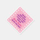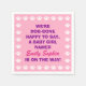 These paper napkins display a pink background with white paw prints and the text "We're dog-gone happy to say, a baby girl named [baby's name] is on the way! These napkins are great item for paw print themed, dog themed, puppy themed, or animal themed baby showers.