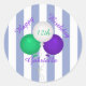 Happy Birthday Stickers, personalised with name and age. Purple, green and white balloons on purple and white striped background.