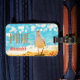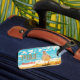 A fun luggage tag with a seagull on a beach background.