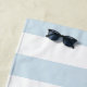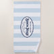 Our personalised, vintage style beach house towel makes a perfect addition to your summer home! Design features nautical pale blue and white stripes and navy blue vintage typography, with your family name and year established for a unique customised touch. Makes a great housewarming gift for new beach house owners!