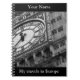A travel notebook featuring a close up view of Big Ben, the iconic London clock, in black and white. It can be personalised with your name, and you can amend the text at the bottom "My travels in Europe" to your own words.