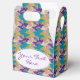 Graphic birds seamless pattern. Tesselation with cute birds in emerald purple and golden tones. Customisable favour box. You can easily change size position of the design (scaling) and add your own text for many occasions.