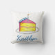 Decorative throw pillow features an original marker illustration of a slice of birthday cake with pink frosting and a candle on top. Simply personalise with the birthday girl's name for a unique gift!