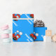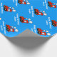 Personalised Birthday wrapping paper | red toy choo choo train. Toy locomotive cartoon design with customisable name of child. Railroad theme gift wrap for young boy or little baby. Blue background colour customisable. Cute idea for 1st Birthday or baby shower party. Children's toy graphics. Also nice for Christmas holidays.