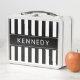 Put your name on this cute striped metal lunch box then look cute when you use it for lunch, display or storage.