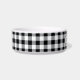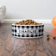 This unique custom pet dog or cat bowl features their name personalised in classic all-caps serif text with a rustic farmhouse buffalo plaid check patterned background in black and white colours. A stylish water and food bowl for your furry family member, available in medium and large sizes.