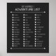 Personalised couple's adventure bucket list poster in dark grey/black with white lettering. Fun check boxes for romantic outdoorsy date ideas. Use this list or edit and create your own! Customise names at the top for a thoughtful wedding, engagement, anniversary, or valentine's day present. Give the gift of adventure with this fun wall hanging!