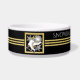 The design features a pair of ice skates over a snowflake crest with black and faux gold glitter background. This elegant winter sports design serves as a cool modern and unique pet bowl with personalised text.