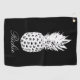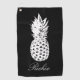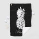 Personalised black golf towel with pineapple image. Elegant golfing gift for men and women who love the game. Classy design with custom name.