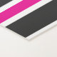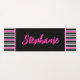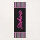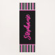 Reversible yoga mat features bright fuchsia pink, white and black stripes and your name down the length of the mat in a fun script type style.