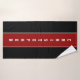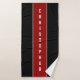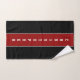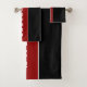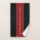 Classic Black Bath Towel Set with two thin white stripes and a wide vertical red stripe on the centre with custom name on it.