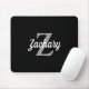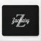 This personalised mouse pad features a light grey monogram and white retro script name on a black background.