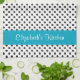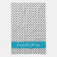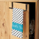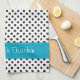 You can personalise the name on this black and white polka dots and blue strip kitchen tea towel. To change the name, use the personalise option. A trendy and chic design.