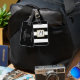 Stylish black & white striped luggage tag with gold foil effect label to add your personalised monogram & custom text.