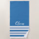 Personalised beach towel with a trendy blue stripe pattern.