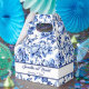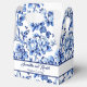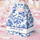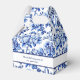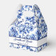 A wedding favour box with a blue floral toile design and space for the bride and groom's name and wedding date.