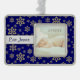 This festive personalised Christmas ornament features pretty gold sparkly snowflake images of varying sizes against a rich dark blue night sky. It makes a pretty background for your own photograph. A silver banner holds your custom text to personalise the ornament. Wonderful for that First Christmas baby photograph!