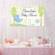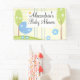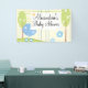 Blue for it's a boy! Custom printed baby shower banner features your text with a cute powder blue stroller cradle, green forest trees and flowers. A very cute way to welcome the new baby boy as a decoration for the walls or entry.