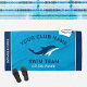 Personalised swim team pool towel design for swimmers features custom text for the swimmer's first and last name, swim team club name, and mascot or other text. Add your team logo to the dolphin placeholder image. The colour scheme of ocean blue, navy blue and white can be modified to coordinate with your team colours. Please contact us at kathleen@plushpaper.com with design questions.