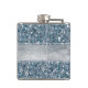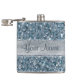 Personalised hip flask with a chic, beautiful faux blue sequins pattern with a glamourous fake silver foil and blue glitter banner in the middle with blue text for you to personalise with your name or any text. PLEASE NOTE: These are flat printed graphics - not real sequins, glitter or silver foil.