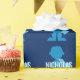 Personalised Blue Superhero Boy Silhouette Kids Wrapping Paper. Blue superhero silhouette pattern on dark blue background. Little boy silhouette has cape and boots, standing in superhero pose with hands on hips. Personalise with name in bright white in centre. Cute superhero theme pattern.