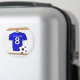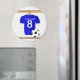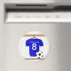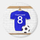 A unique sports design with a blue and white soccer jersey with a soccer ball hanging in a locker room which is fully customisable with your own name and number. An ideal personalised gift for any soccer player or soccer fan.