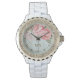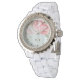 The design is set within a crystal-accented metal bezel and paired with a glossy white enamel alloy bracelet, creating a look that is feminine, graceful, and effortlessly polished. Subtle gold-tone detailing on the dial adds warmth and balance, allowing the floral artwork to remain the focal point.