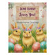 Celebrate Easter with this adorable, boho-inspired postcard, perfect for little girls! Featuring three fluffy yellow bunnies with flower crowns, hopping through a colourful meadow filled with wildflowers and pastel vibes. A rustic wooden sign reads, ‘Some Bunny Loves You!’ while the customisable text says, ‘Happy Easter, [Name]’—defaulted to ‘Happy Easter, Courtney’ but easily altered by the buyer. This charming, whimsical design blends boho flair with Easter sweetness, making it a delightful keepsake or home decor gift for your special bunny!