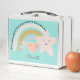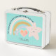 Modern adorable boho watercolor pastel rainbow lunch box, with a little pink heart and stars, and your child's name.