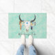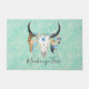 Modern watercolor design features decorated Boho style skull with feathers and beads on light aqua / gold dots watercolor background. Personalise with your "tribe" details or other special message