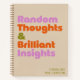 Unleash your creativity with this personalised notebook, featuring bold, retro-inspired typography that declares "Random Thoughts & Brilliant Insights." Designed with a neutral beige background and vibrant accents of purple, orange, and green, this notebook is as stylish as it is functional. Whether you're jotting down ideas, writing your next big project, or organising your daily thoughts, this notebook fits the task. Available with lined, blank, graph, or dotted pages, it’s perfect for students, professionals, and creative minds alike. Customise the name for a personal touch and make it a thoughtful gift for writers, thinkers, or anyone who loves unique stationery.