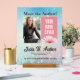 Create a memorable impression at your next author event with this customisable poster with a wooden stand, part of the Bubbly Blue Bokeh Book Bash Collection. Featuring a soft blue bokeh background, this poster offers spaces for your author photo and book cover, along with editable text for your name, genre, book title, and website. The modern typography and pink floral accent give the display a professional and inviting look, perfect for "Meet the Author" events, book signings, and launch parties.