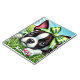 An adorable Boston terrier puppy adorned with a green striped bow lies on fresh grass. Bright sunlight and vibrant colours create a joyful and heartwarming atmosphere, with gift boxes adding an element of surprise.