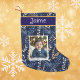 Cute personalised stocking with boy's picture and name. Pretty blue background with gold holiday foliage accents. Upload your chlid's photo and add their name in the personalise area.