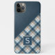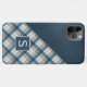Contemporary tan, brown, beige, taupe, and dark teal blue coloured tartan plaid, and a faux leather texture pattern background. With room to customise or personalise with a name monogram or initial of your choice. Beautiful, modern, and cool cover for the trend-savvy and art-loving hip trendsetter, artsy motif lover who wants to protect their phone from dust and dirt, wear and tear. This design is available in Apple iPhone 6, 7, and 8 Plus, 10 or X, XR, XS, 11, 12, 13, 14 Mini, 15 Plus, and Pro Max cellphone cases. Show off your style, look fashionable, and feel stylish with a unique design on a mobile device accessory of your choice.