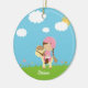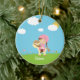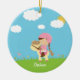 This round ceramic ornament has a cute brown hair girl with braids riding on a cartoon horse in a field of flowers. There is white puffy clouds in the sky with the sun peeking out from behind one cloud. This can easily be customised with a name at the bottom. Graphics by Zenware Designs at Mygrafico