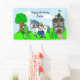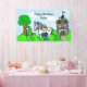 Little brown haired Prince with crown and sword, and his pet horse, dragon and frog with a castle and tree with an owl in the background, personalised Birthday banner.