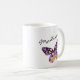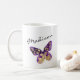 Elegant Girly Purple and Gold Butterfly personalised custom Name Mug. Features a purple and gold shimmer faux foil butterfly design with a name in handwritten scripted font. this would make a perfect gift for someone or for yourself! Personalise it to make it your very own!
