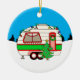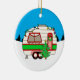 Cute vintage red and green retro RV camper camping themed Christmas ornament. Hand drawn cute personalised holiday ornament. Camping in winter.