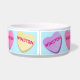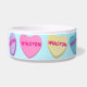This Valentine's Day show your dog or cat how much you love them all month long or all year long. Nostalgic candy hearts in pastel pink, green, purple, yellow, and blue circle this pet bowl and each heart is customised with your dog's name. A very cute personalised design for your pet. Light blue background.