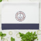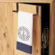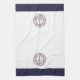 Personalised captain anchor logo kitchen towel with your name and boat name. Navy blue and red circle emblem on a white background with navy blue border.