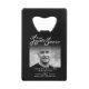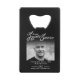 Funeral personalised celebration of life favour bottle opener in a simple black and white reads in our hearts forever with two photos that you can use to display photos of your dearly departed as a keepsake. Personalise with your loved ones name and birth and death dates. This funeral keepsake in our hearts forever opener is designed to complement any remembrance event, this keepsake offers a subtle yet meaningful way to celebrate a life well-lived. Original typography and heart graphic design by Sarah Trett for www.mylittleeden.com (Photo credit by Guilherme Stecanella on Unsplash model photo is just a placeholder image for you to replace).