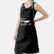 Cool Customisable Personalised Black Chef Mens Womens Apron. Displayed is black chef apron with cool knife design and customisable chef name in white letter print. Apron colour, strap colours are customisable to suite your needs to your personal taste and needs. The graphic of chef knife is provided in two black and white colours to accommodate light or dark aprons.