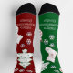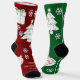 Christmas socks featuring a whimsical one red, one green design. The socks are adorned with artwork of Christmas trees, stockings, ornaments and gifts. The art is surrounded by snowflakes, with room for names or a custom message on each sock! Message MineByDesign for help with this design or any other design you envision!